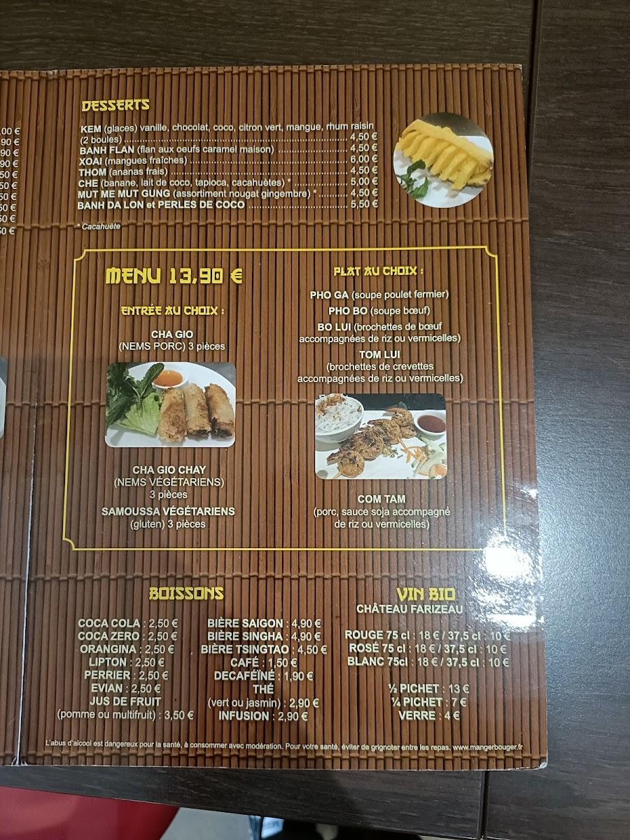 In conclusion, the menu at An Tam in Pessac offers a well-balanced glimpse into Vietnamese flavors, combining comforting classics with carefully prepared specialties that feel both authentic and approachable. Dishes like Mi Xao Tom stand out for their satisfying combination of stir-fried noodles and fresh shrimp, while the Brochette de Bœuf Mariné delivers rich, smoky notes with a tender texture that reflects thoughtful seasoning. Starters such as Samoussa Poulet provide a crisp, flavorful introduction, adding variety and a touch of indulgence. To complement the meal, the inclusion of Vin Bio Local shows a pleasing attention to pairing and locality. Altogether, the menu reflects consistency, freshness, and a clear respect for traditional tastes presented in a refined yet welcoming way.